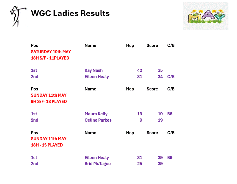 Saturday 10th & Sunday 11th - Ladies Results